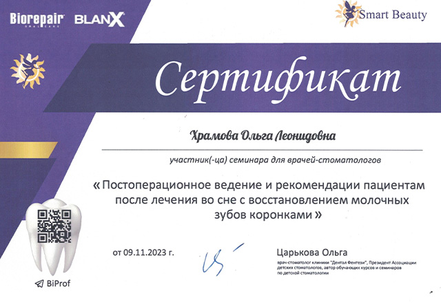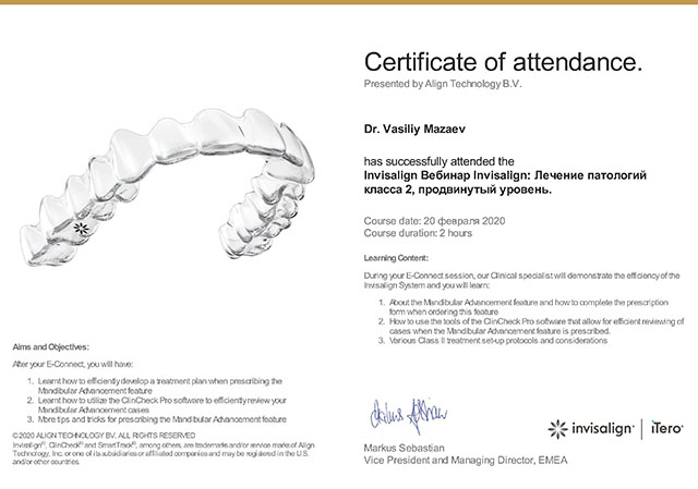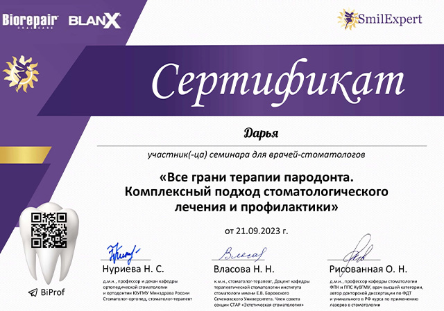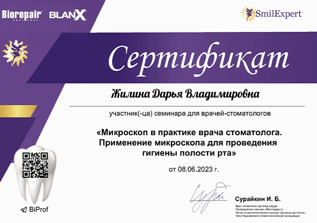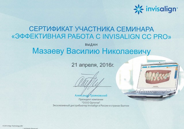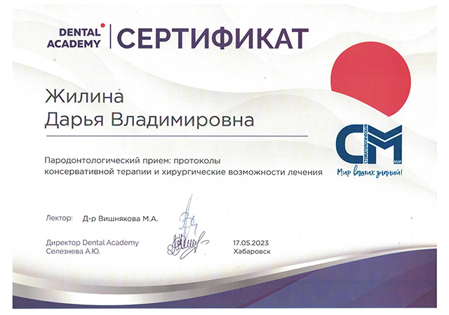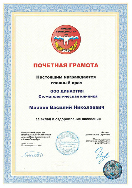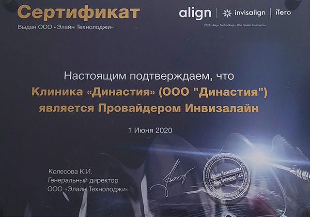 1 июня 2020 года клинике «ДИНАСТИЯ» был выдан сертификат ООО «Элайн Технолоджи» подтверждающий то, что ООО «ДИНАСТИЯ» является Провайдером ИНВИЗИЛАЙН, а в 2020 и 2023 годах наша клиника вошла в число лауреатов Национального конкурса «Лучшие стоматологи РФ».